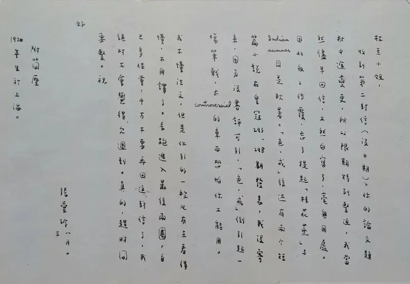 五月选载好文不少,最值得关注的莫过于陈子善《新发现张爱玲致林玉手札初探》一文。林玉赴法留学期间与张爱玲多次通信,她的求教得到了耐心的回应。林的去信或已不存,三封留存下来的回信得以发现,对张学研究颇有参考价值。如陈子善所言,张爱玲对《金锁记》与《怨女》之间的关系一直未做说明。新发现信札中对此略有提及,这“很难得,也很重要”。陈子善认为,这三通信札是近八九年来张爱玲手札发掘的“最大收获”,亦可部分地改变人们对张后期不愿与外界接触的片面看法。