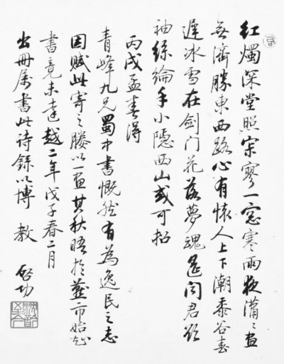 并钤“启”“沈吟至今”两方印。柴德赓与启功、周祖谟、余逊,并称陈垣先生门下“四翰林”。柴、启两先生相交数十年,感情深挚。柴先生去世后,启先生饱含深情地写了挽联:“节概见生平,业广三余,众里推君才学识。切磋真苑友,心伤永诀,梦中索我画书诗。青峰先生千古,弟启功敬挽。”不独可以看出启先生对友人去世深沉的痛楚,从“梦中索我画书诗”一句,亦可见柴先生对启先生画作、书法、诗作的欣赏。而启先生1946年赠柴先生诗及画,亦可与此印证。