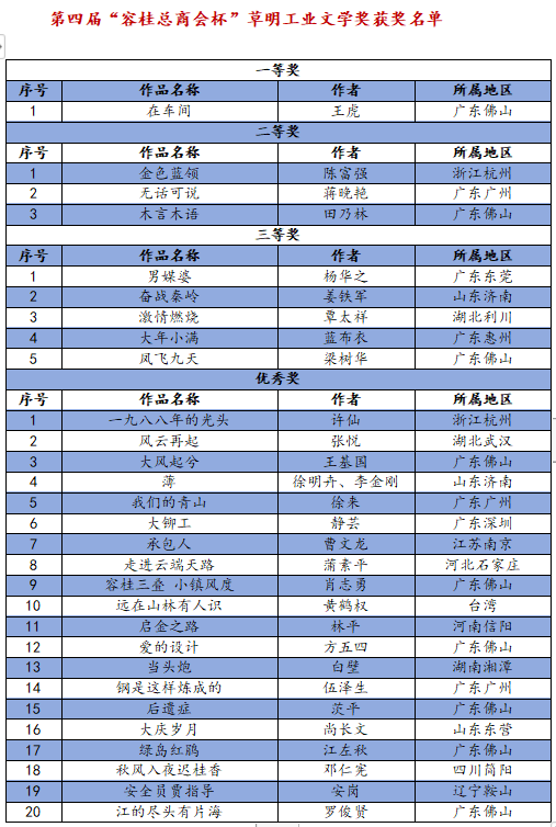 第四届“容桂总商会杯”草明工业文学奖,吸引了全国各地一大批作家和文学爱好者参加,共收到来稿326篇,其中小说作品205篇,报告文学作品121篇,初选入围作品60篇。作品题材涵盖各个工业战线的各个领域,描述产业工人、创业者的心路历程和人生感悟,展现在工业时代中奋力拼搏的创业故事。经过中国冶金作家协会副主席刘盛超等评委对参评作品进行初评和终评,最终评选出一等奖1名、二等奖3名、三等奖5名,以及优秀奖20名。