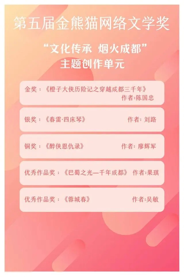 现场揭晓了第五届“金熊猫”网络文学奖获奖作品名单。本届“金熊猫”网络文学奖共征集322部作品,涵盖古典仙侠、现实百态、传统武侠、时空穿越等题材,最终角逐出17部获奖作品。其中,《我为中华修古籍》获第五届“金熊猫”网络文学奖长篇单元金奖,《水安息》获中短篇单元金奖,《橙子大侠历险记之穿越成都三千年》获“文化传承 烟火成都”主题创作单元金奖。此外,《凤凰彩票这十年》《时光织锦店》《春棠欲醉》等作品分获最具时代精神奖、最具创意价值奖和最具潜力IP奖等奖项。