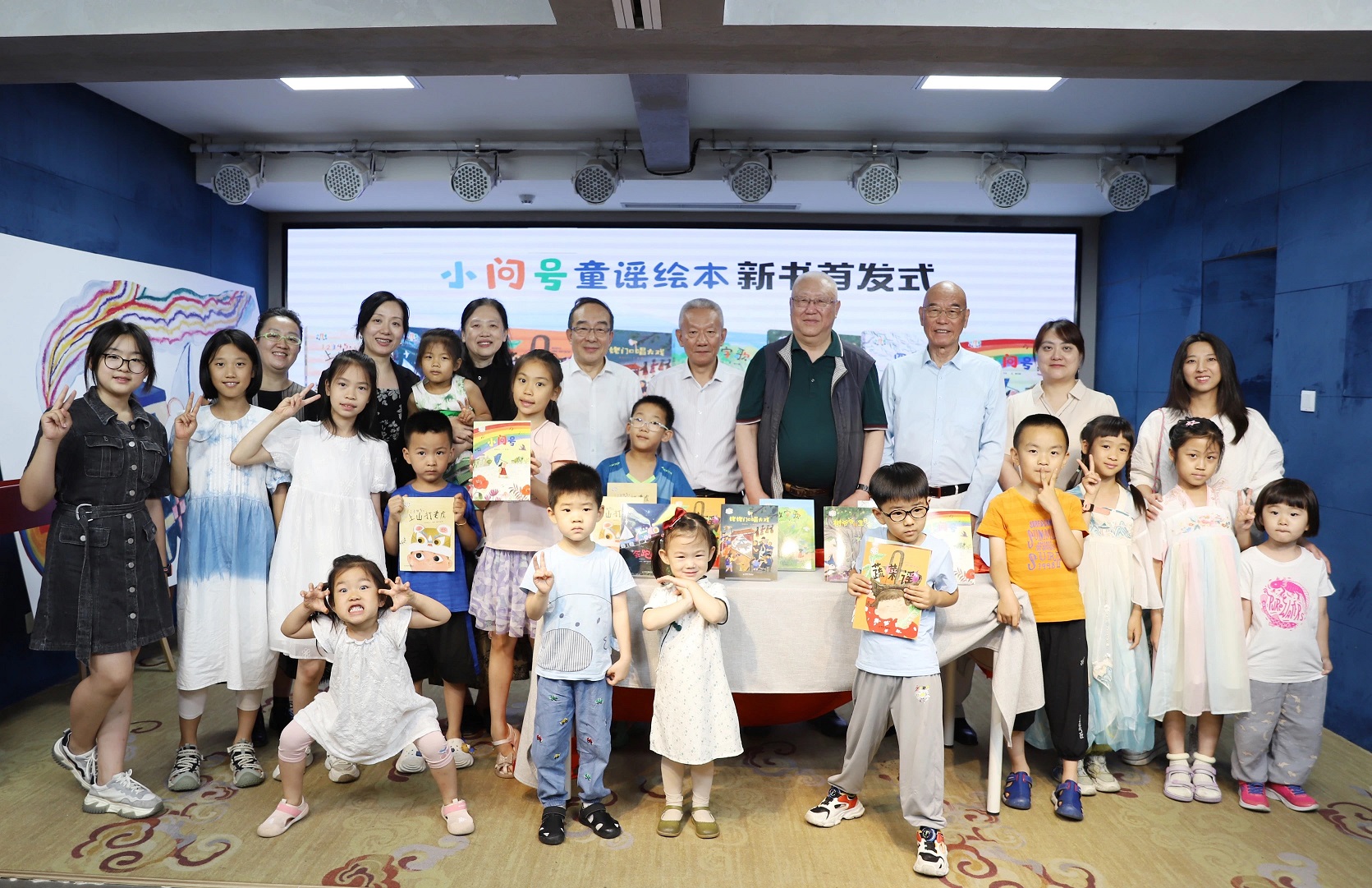 邬书林、高洪波、郭义强、海飞、陈晖、纳杨、林云一起为“小问号童谣绘本”新书揭幕,并和现场的小朋友们一起合影。