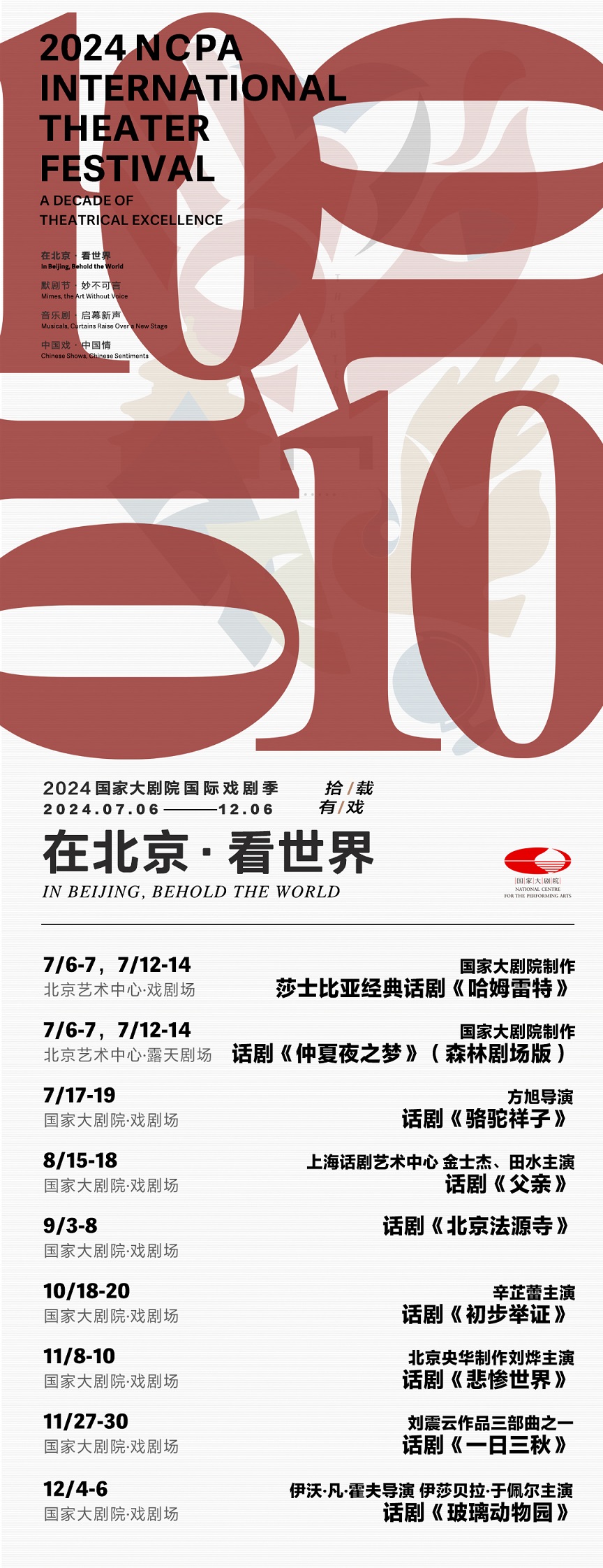 7月6日至12月6日,2024国家大剧院国际戏剧季将再启华幕。本届戏剧季围绕“拾载有戏”主题,以十年积淀精粹17台62场佳作,广邀中国、俄国、法国、英国、瑞士等多个国家的戏剧名作,以“在北京·看世界”、“默剧节·妙不可言”、“音乐剧·启幕新声”、“中国戏·中国情”四大板块展开。国家大剧院制作莎士比亚话剧《哈姆雷特》、《仲夏夜之梦》(森林剧场版)将为戏剧季开幕,闭幕演出则为由伊沃·凡·霍夫导演、伊莎贝拉·于佩尔主演的《玻璃动物园》。