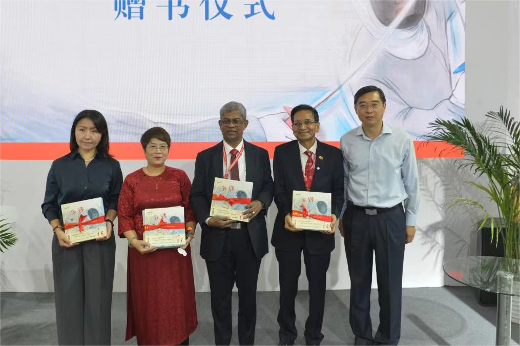 江苏凤凰出版传媒集团党委书记、董事长章朝阳向“闪光少年”系列海外版权合作出版社代表赠送样书。