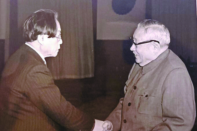1982年12月,廖承志(右)在北京人民大会堂会见野间宏。