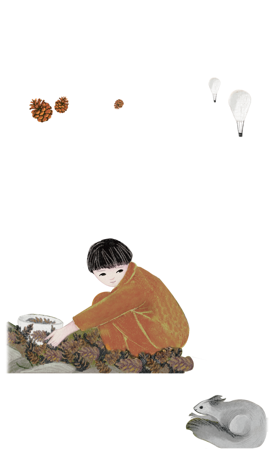 河悦叔叔是和爸爸乘同一个氢气球上去打松塔的。氢气球载着他们在天上飘,还有两个工人在下面扯着两根绳子,像放风筝似的。上面的人打松塔的工夫,“放风筝”的人会把两根绳子拴在树上,有时候赶时间,就用手扯着。一棵树上的松塔打完了,就换下一棵树,氢气球就这样在密林中走走停停。两只“细脚”在山里走,氢气球像云一样在树梢上飘,打松塔的人就立在云上。