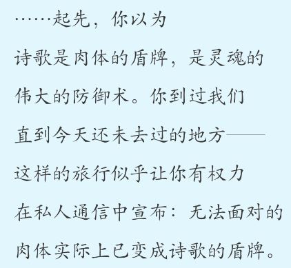 诗人的词语并不来自词典,而是来自生活。和所有热爱生活的普通人一样去生活,去经历、去承受命运分配给你的那一份幸福和痛苦,去劳作和创造,去观察和发现,去感受和体验,让你对生活的爱成为诗的源头。无论生活的处境如何,无论在最后的时间里生活面临怎样的挑战,保持感受力的完整、开放,让同情和怜悯永远陪侍左右,永远不要麻痹和冷漠……