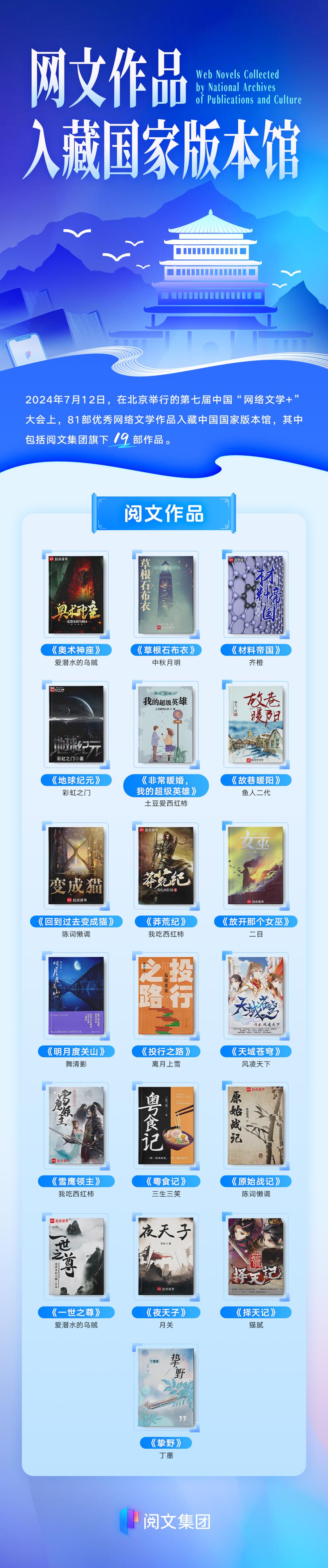 大会同时举行优秀网络文学作品入藏中国国家版本馆仪式,共计81部作品入藏,包括19部上海企业阅文集团旗下作品。至此,阅文旗下作品入藏国家版本馆的数量增至76部,《庆余年》《大奉打更人》《诡秘之主》《全职高手》等众多经典名列其中,覆盖科幻、现实、历史、仙侠、玄幻、言情等多元品类,呈现出网络文学类型结构持续优化的发展趋势。近年来,阅文旗下作品陆续入藏中国国家图书馆、国家版本馆、上海图书馆和大英图书馆,累计数量逾300部次,推动中国网文走向全球文化市场,成为网络文学主流化、精品化加速发展的缩影。