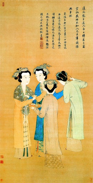 晚明至清,陆续有来自西方的传教士如利玛窦、郎世宁等人带来全新的绘画样式,为仕女图的创作注入了新鲜血液。尤其是康乾时期,以焦秉贞、陈枚等人为代表的宫廷画家,在中国传统绘画样式中引入西方的明暗、透视等绘画理念,将西画追求写实的造型方法和空间意识运用到中国画的创作中,开仕女题材绘画新风。这一时期涌现出的许多仕女题材作品笔法工整,设色浓艳,人物大多脸庞长圆,柳眉细目,面部塑造多以赭石等色彩晕染出明暗关系,使结构更加丰满、立体。