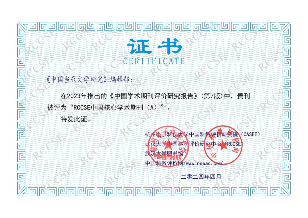 近日,武汉大学中国科学评价中心(RCCSE)公布了最新的学术期刊评价结果《中国学术期刊评价研究报告》(第7版)。报告显示,《中国当代文学研究》被评为“RCCSE中国核心学术期刊(A)”。