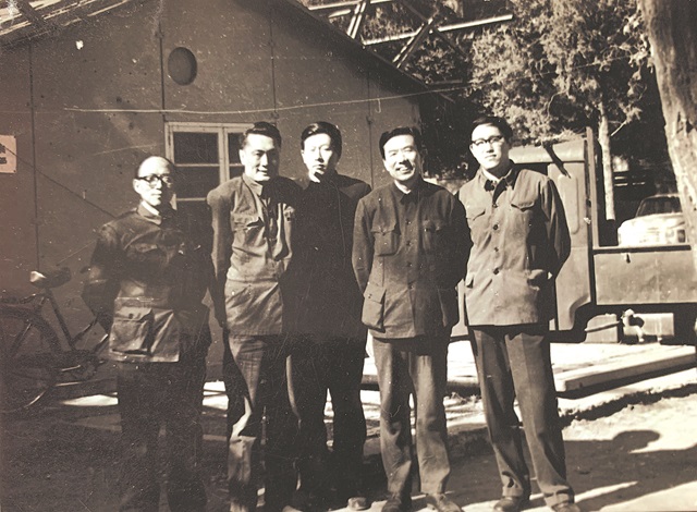 在《文艺报》简易楼前。左起为郑兴万、谢永旺、寒小风、唐达成、高洪波