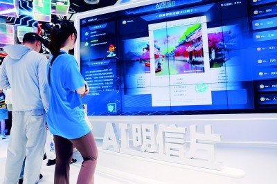 新的人工智能技术可以为人们提供定制诗歌和明信片。图为观众正体验可以生成诗歌的AI大模型。光明图片/IC PHOTO