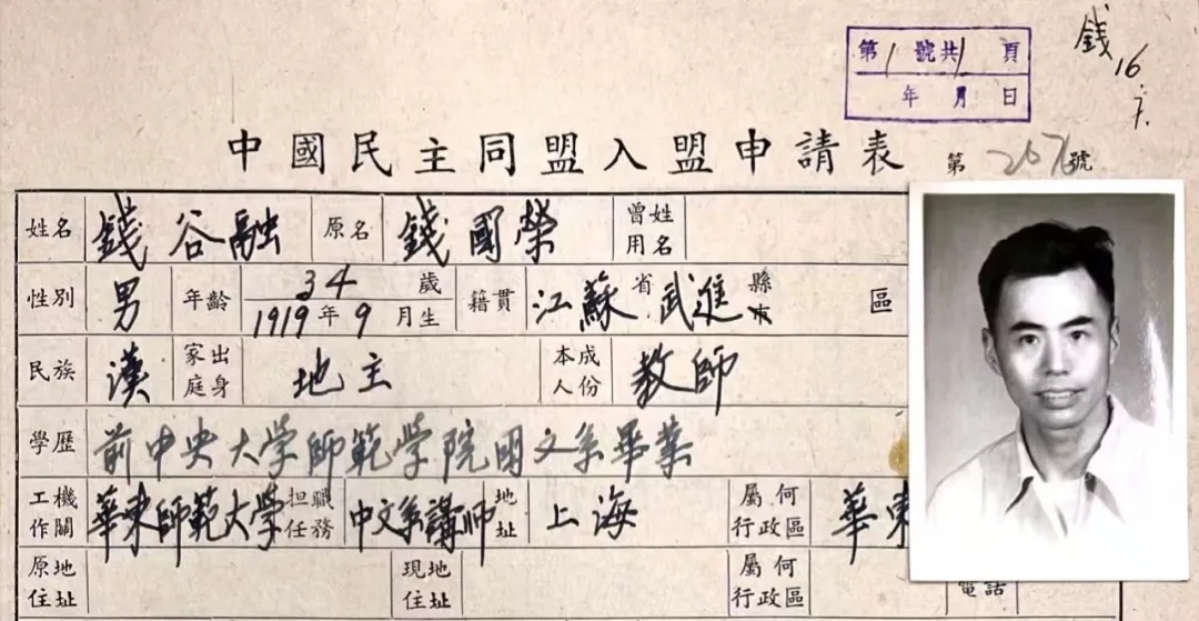 1952年钱谷融入盟申请表
