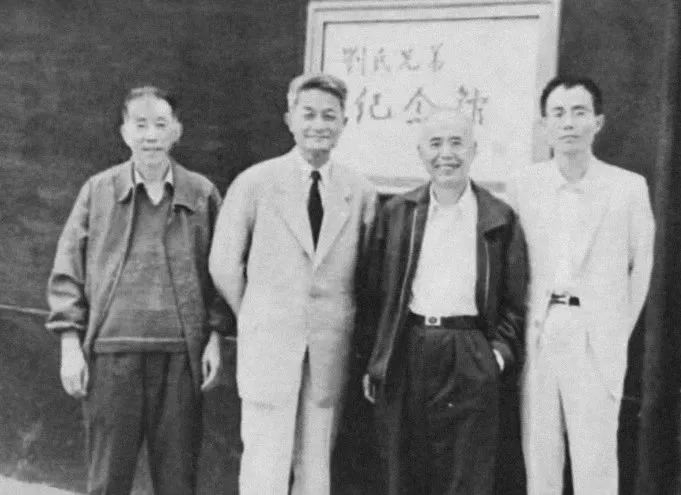 1991年5月,摄于江苏江阴刘氏兄弟纪念馆前,左起:丁景唐、徐中玉、钱谷融、陈子善