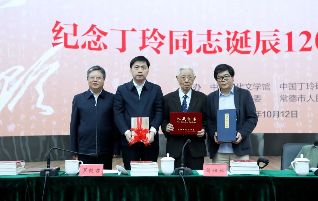 座谈会现场还举行了丁玲手稿展和图书捐赠仪式。现场展出了丁玲人生不同阶段的代表性照片,以及《建设新中国之文艺工作》《鲁迅先生于我》《我所认识的瞿秋白同志》等珍贵手稿。蒋祖林、中国社科院文学所学者何吉贤、河北教育出版社党委书记董素山共同向中国现代文学馆捐赠了《丁玲作品精选集》,中国现代文学馆常务副馆长王军接受捐赠并回赠入藏证书。