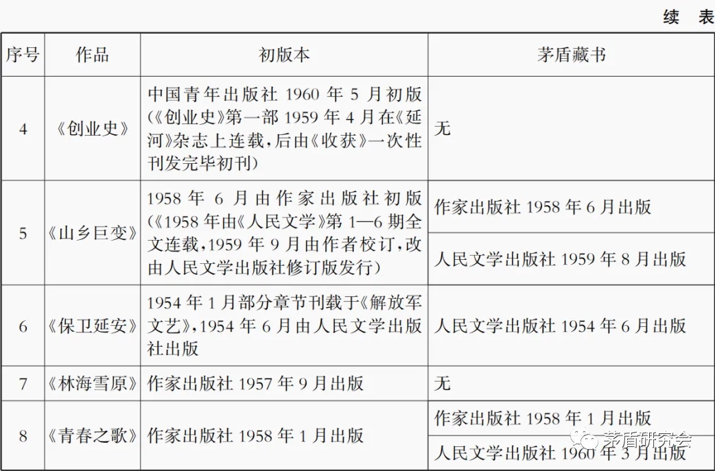 从藏书情况可以看出,茅盾对于作品的收藏情况,既有单本收藏,如《红岩》《红日》,也有副本的收藏,如《山乡巨变》《青春之歌》,既有初版本,如《红岩》《保卫延安》,也有非初版本的收藏,如《红旗谱》《山乡巨变》《青春之歌》。