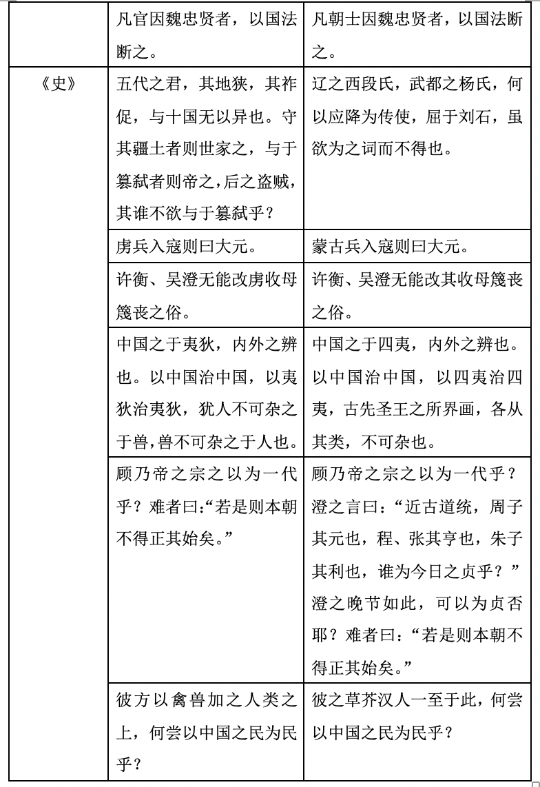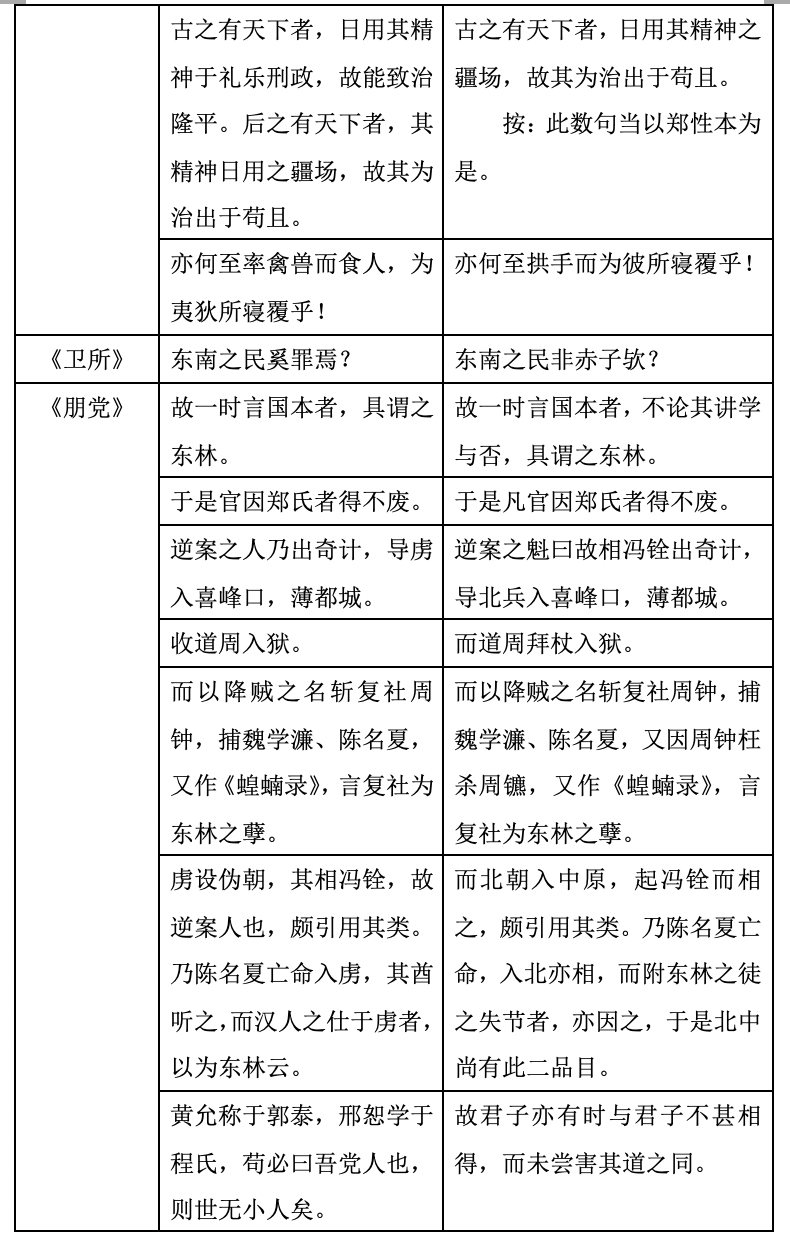 由表中文字可知,在冯贞群先生传钞本所据的原本(即所谓的万斯选订本)上已将“夷狄”、“胡”、“虏”、“伪朝”、“禽兽”等违碍字进行了删改,于是,显得不是很尖锐。