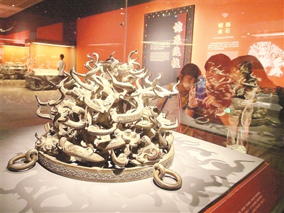 观众欣赏曾侯乙墓出土的战国建鼓铜座。