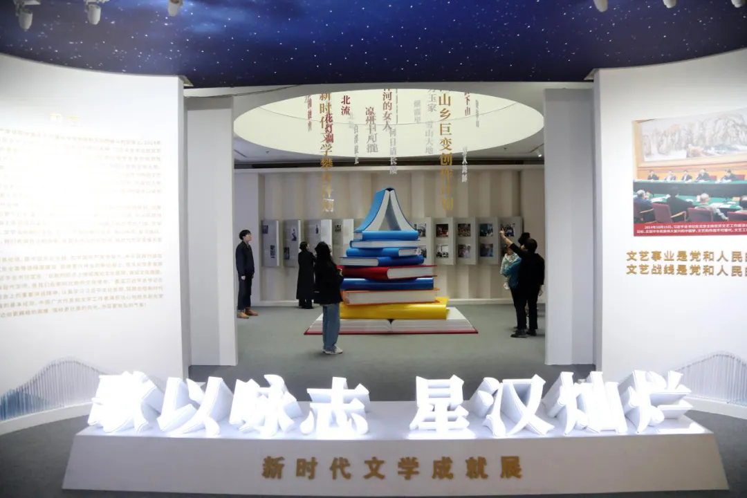 图为“歌以咏志 星汉灿烂——新时代文学成就展”展厅中央,围绕凤凰彩票“新时代山乡巨变创作计划”和“新时代文学攀登计划”打造的巨型艺术装置。中国现代文学馆供图