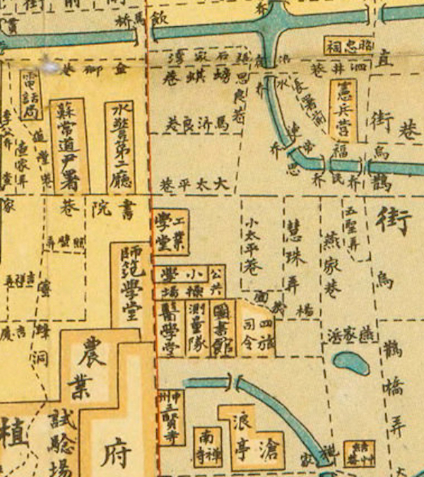 潘钟瑞则是吴昌硕和徐熙共同的朋友,凤凰出版社出版的《潘钟瑞日记》是我的枕边读物。熟悉的地名,熟悉的人物,读起来倍感亲切。潘钟瑞在光绪十年正月的日记写道:“晨至吴仓石寓,谈次,看其近作篆刻、画幅,又至其西邻徐翁子晋家,不值,两人同在大太平巷也。”再有一则这么记录:“至(燕家巷)书局寻查蕉垞,不值,出南宫里,至(徐康)家。”这年,吴昌硕有诗题记:“甲申暮春,自南宫里移居西畮巷。”可知徐熙父子曾和吴昌硕做过邻居。而徐沄秋《吴门画史》称吴昌硕曾住在帝赐莲桥,翻阅光绪以后的苏州地图,均找不到“南宫里”,对照下图中的“帝赐莲桥(帝思连乔)”,结合吴昌硕“其西邻”徐家在“大太平巷”,“南宫里”位置基本就能确定了。