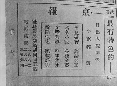 社址位于“宣外魏染胡同35号”的《京报》,“和平门外八角琉璃井”的《真报》,“宣武门外大街路东”的《新北平报》,“宣外椿树上三条28号”的《立言报》,“宣内未英胡同甲9号”的《民声报》。