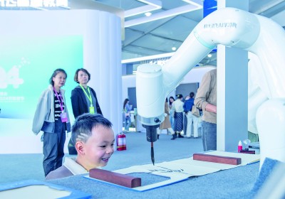 观众在参观第七届世界声博会上的一款文艺创作机器人。新华社记者 傅天摄