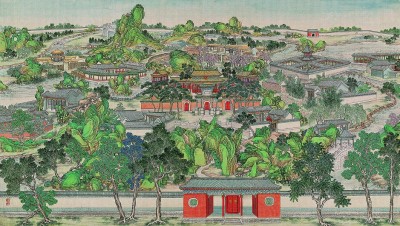 清代画家孙温历时数十载完成的绢本工笔彩绘册《红楼梦》,现存总计230幅,其篇幅之巨、细节之丰、场面之宏大、笔法之精细、用色之考究,堪称《红楼梦》题材绘画史上的经典。红学家周汝昌曾评价孙温绘本是“融合了年画、风俗画、寺庙壁画,乃至宫廷行乐图的画风技法而形成的一种十分可喜可贵的艺术流派”。其中的《大观园全景图》采用鸟瞰式构图,清晰描绘了大观园的主要景观。大观楼及顾恩思义殿建筑群巍峨壮观,凸显金碧红绿意象。分布的别墅建筑则依不同人物的性格特征设色,雕梁画栋,在精致贵气的基础上强化白色、灰色等元素,凸显众金钗高雅的审美趣味。翠嶂林木间亭台楼阁错落有致,视野开阔。画面布局以大观园正门、翠嶂、省亲别墅形成中轴线,两侧的景观院落结构清晰,刻画细致,主要山脉、水系一目了然,空间远透。画家通过对山脉、水系及远处阔野的描绘,强化了大观园的自然属性,扩大了其物理及想象空间。在色彩运用方面,以红、绿、金、白四种色调凸显了大观园“金碧辉煌、怡红快绿”的文本意象。