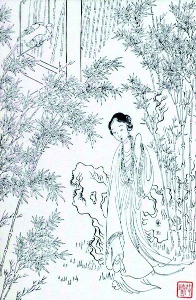 清代画家改琦的《红楼梦图咏》则更加注重作品的绘画性与意境美。“潇湘清韵”与“竹林风骨”使黛玉之美别具韵致,画面中的林黛玉从潇湘馆竹径中款款而来,一只手抬起,似拭泪之状,另一只手隐在袖中,呈现弱柳扶风之态,背景竹石笔墨简逸。从线的造型来看,改琦笔下的线条轻细、秀润、圆浑,内力充盈,如行云流水,在动静结合之中生动表现了林黛玉沉湎于自身情绪而又洁身自好的性格特征。