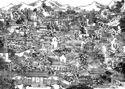 国画大家潘天寿曾言:“吾国绘画,以笔线为间架,故以线为骨。”传统中国画的白描技法以线造型,通过线条的轻重缓急、疏密聚散、顿挫刚柔、浓淡干湿塑造空间物象,有着很强的表现力。在众多版本的《红楼梦》中,《增评补图石头记》影响较大。其中,《增评补图石头记》万有文库版中的《大观园总图》采用白描技法绘制,图中景物细密、元素齐备。在空间布局上,画家采用了并置手法,将大观园以建筑或主题景观分割成若干子画面,每个子画面配置主题人物,以“画中画”的形式呈现出大观园的整体架构及主要景观。从建筑组合到院落围墙,从石景溪水到林木花草,透过细腻的笔触,观者可以感受到丰富的园林意蕴。画家对每一处庭院结构的刻画均力求精准,透露出深厚的绘画功底与园林造诣。
