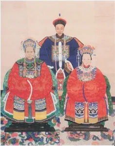 据《越城周氏支谱》记载,孙月仙“生道光癸巳九月十九日子时,卒同治甲子九月初五日亥时”[23],即生于1833年10月31日,卒于1864年10月5日。她于1858年生周德(周氏兄弟的大姑母),1860年生周伯宜(周氏兄弟的父亲)[24]655;其间还生育过一个儿子,但夭折了[25]。她去世时仅有31岁,与幼年魏连殳眼中“年青,好看”的形象相符合。孙月仙画像现藏绍兴鲁迅纪念馆,这是一张周福清与孙氏、蒋氏的彩绘神像,纵167.8厘米,横113.5厘米,20世纪50年代由周作人捐赠(见图1)。由于有两名子女长大成人,孙月仙在周氏家族中一直被纪念,周作人称其为“先祖妣孙太君”,在日记中记载了周家在其生辰、忌日对她的祭祀。