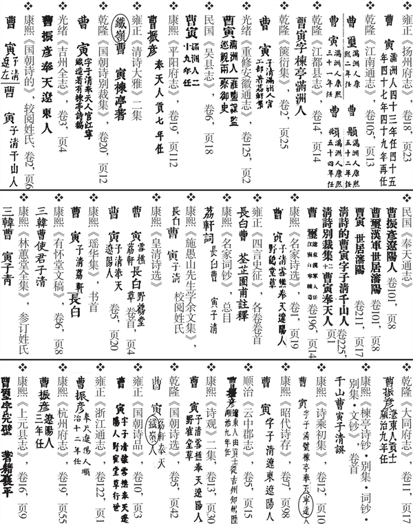 至于曹寅在其助印且校阅的施闰章《学余全集》中署名“长白曹寅子清”,友人韩菼(音“毯”)于《织造曹使君寿序》中称他为“三韩曹使君子清”,吴绮文集的参订姓氏中亦记“三韩曹寅子青”,寅弟荃在序《四言史征》时自署“长白曹荃”(图表1.2),应均是用“三韩”与“长白”来泛指辽东(指辽河以东的地区),此为明清文士圈常见不直用地名的儒雅做法,类似情形亦可见于三湘、岭南和八闽等例。