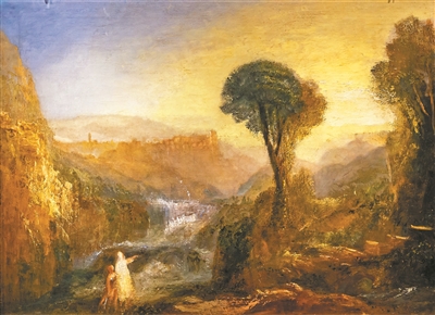 完成于1835年的《帝沃力:托比亚斯和天使》(见图,马躏非供图),着重表现了夕阳下意大利帝沃力山区的旖旎风光。云霞映着落日,蓝天逐渐褪去;金色暮霭中,远山如黛。画家用薄涂法生动表现出远处天空和景致的朦胧飘渺,近处的山石和树木则采用不透明颜色的厚涂法描绘。溪流从远处山间蜿蜒而至,画面左侧耸立的巨石似乎能反射夕照,透纳用近乎干笔皴擦出石头的肌理和飞溅的浪花,整幅作品既宁静古典,又壮美神秘。