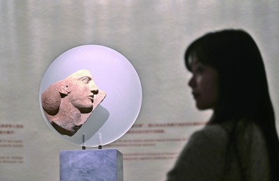 观众在观看古希腊大理石女性头像浮雕圆盘残片。新华社发