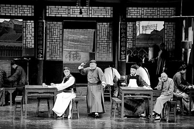 《茶馆》剧照,左起:杨立新饰秦仲义,梁冠华饰王利发,濮存昕饰常四爷,冯远征饰松二爷