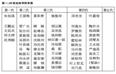 20世纪中国五代词学传人,代表五个不同世代或者辈分。一个世代二十年。以出生年份计,但非以单个人计,而是以世代计。如图所示:第一代,1855年(清咸丰五年)至1875年(清光绪元年)期间出生者。五人组合,一支篮球队。代表人物朱祖谋,“集清季词学之大成”“为词学之一大结穴”(叶恭绰《广箧中词》)。五大词人业绩建树,主要在继往。而活动年代,除文廷式、王鹏运外,郑文焯、朱祖谋、况周颐三人均进入民国。第二代,1875年(清光绪元年)至1895年(清光绪二十一年)期间出生作者。十一人,一支足球队。代表人物王国维与胡适。一个着眼于意和境,以有尽、无穷,评定优劣、高下;一个着眼于人和事,以匠手、天才,评定高下、优劣。前者以治哲学方法治词,能写、能观,善入、善出,充满睿智;后者以治史学方法治词,设想、求证,选择、去取,代表识见。中国词学之由旧到新的推进,亦即由传统向现代化的推进,王、胡二氏,已在理论和实践两个方面作充分准备。第三代,1895年(清光绪二十一年)至1915年(民国四年)期间出生作者。二十二人,两支足球队。百年词业之中坚力量。甲队领军人物夏承焘,民国四大词人之首。在词的创作、词学考订以及词学论述几个方面,均有卓著建树。乙队领军人物施蛰存,继龙榆生之后,创办《词学》刊物,主持全国规模词学讨论会,于词学蜕变期,发挥一定组织、领导作用。所谓挽狂澜于既倒,扶大厦之将倾,其于词学的特别贡献,无可取代。第四代,1915年(民国四年)至1935年(民国二十四年)期间出生作者。二十二人,两支足球队。由正到变的转换。两位领军人物,邱世友和叶嘉莹,着力于论述与评赏。其正与变,导向并不完全一致。第五代,1935年(民国二十四年)至1955年期间出生作者。崛起于20世纪之最后二十年。共和国第一代。其代表作者及座次,留待后来者论定。