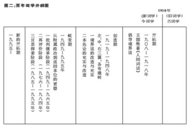 中国今词学,这是有关20世纪中国倚声填词实践及理论亦即创作及批评的一门学科。这门学科,由三个部分所组成,其发生、发展时间自1908年至1995年,包括三个时期。三个部分,曰:词的创作、词学考订、词学论述。统称倚声三事。三个时期:开拓期、创造期、蜕变期。三个时期,相关人物及事件共同构建中国今词学。多年前,依据这门学科在20世纪的生成状况,我曾效法胡适《千年词史开辟图》(参见拙作《百年词学通论》),制作《百年词学开辟图》,将王国维所创立中国今词学三个时期的发展、演变,如图加以展示(见图二)。