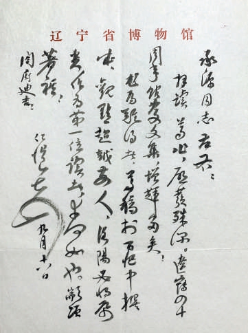 这封信写于上世纪八十年代末,即辽宁省博物馆建馆四十周年前夕,筹备出馆庆文集的时候;落款是“九月十八日”,可知确切时间为一九八八年九月十八日。从内容上看,杨先生为筹备馆庆文集向马承源馆长约稿,马馆长“交卷”后杨先生写信致谢,赞赏有加。信中如“观点超越前人,洛阳必将纸贵”云云,应属尺牍中夸奖对方之惯用套语,作为受信者一方,是当不得真的。