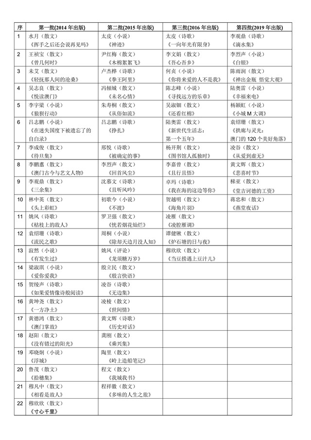 “澳门文学丛书”自2012年开始启动,启动以来已出版了四批共66册,包括2014、2015、2016、2019年推出首批22册、第二批21册、第三批13册以及第四批10册的澳门文学作品。是次出版的一套13册第五批丛书连同第一至四批,共出版79册,分散文、诗歌、小说三种体裁,涵盖当今澳门文坛具有广泛代表性的作家和作品,忠实反映澳门文学的全貌。