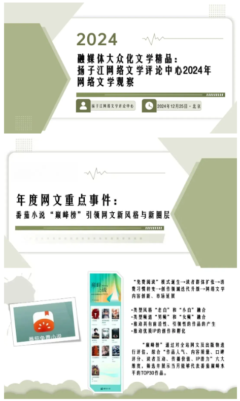 扬子江网络文学评论中心发布2024年网络文学年度观察,并举办本次融媒体大众化文学精品研讨会,旨在系统梳理和深入总结2024年度网络文学在创作趋势、题材文化、传播形式等方面的显著变动,全面分析网络文学的发展与市场的互动关系,关注这一领域涌现出的新趋势、新现象,以及背后所蕴含的文化意义和产业动能,期待此次活动能够为网络文学行业发展提供一种具有前瞻性的参考,助力网络文学在新时代不断实现更高质量的发展。