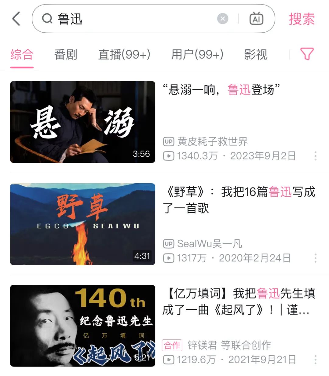不过,倘若在站内搜索关键词“鲁迅”,前述以讲解鲁迅原作文章为主要内容的视频,排名其实并不靠前。按热度排序,标题内包含“鲁迅”的短视频中,播放量排在前三位的分别是“悬溺一响,鲁迅登场”(1334.2万)“《野草》:我把16篇鲁迅写成了一首歌”(1314.3万)“【亿万填词】我把鲁迅先生填成了一曲《起风了》”(1215.7万)。第一顺位的视频标题化用“悬溺一响,纯爱登场”,内容是电影《觉醒年代》中鲁迅相关片段混剪,配上“纯爱向”影视剧情混剪常用的bgm(背景音乐)《悬溺》,强化“革命鲁迅”的理想主义色彩,同时增添了一分青春浪漫的“偶像”气质。第二、三顺位的视频都是音乐类二创作品,无论是将《野草》中的散文诗作品改编成歌词,还是把作家为人为文的人生经历改写成歌词,都是以鲁迅作为素材进行的衍生创作。