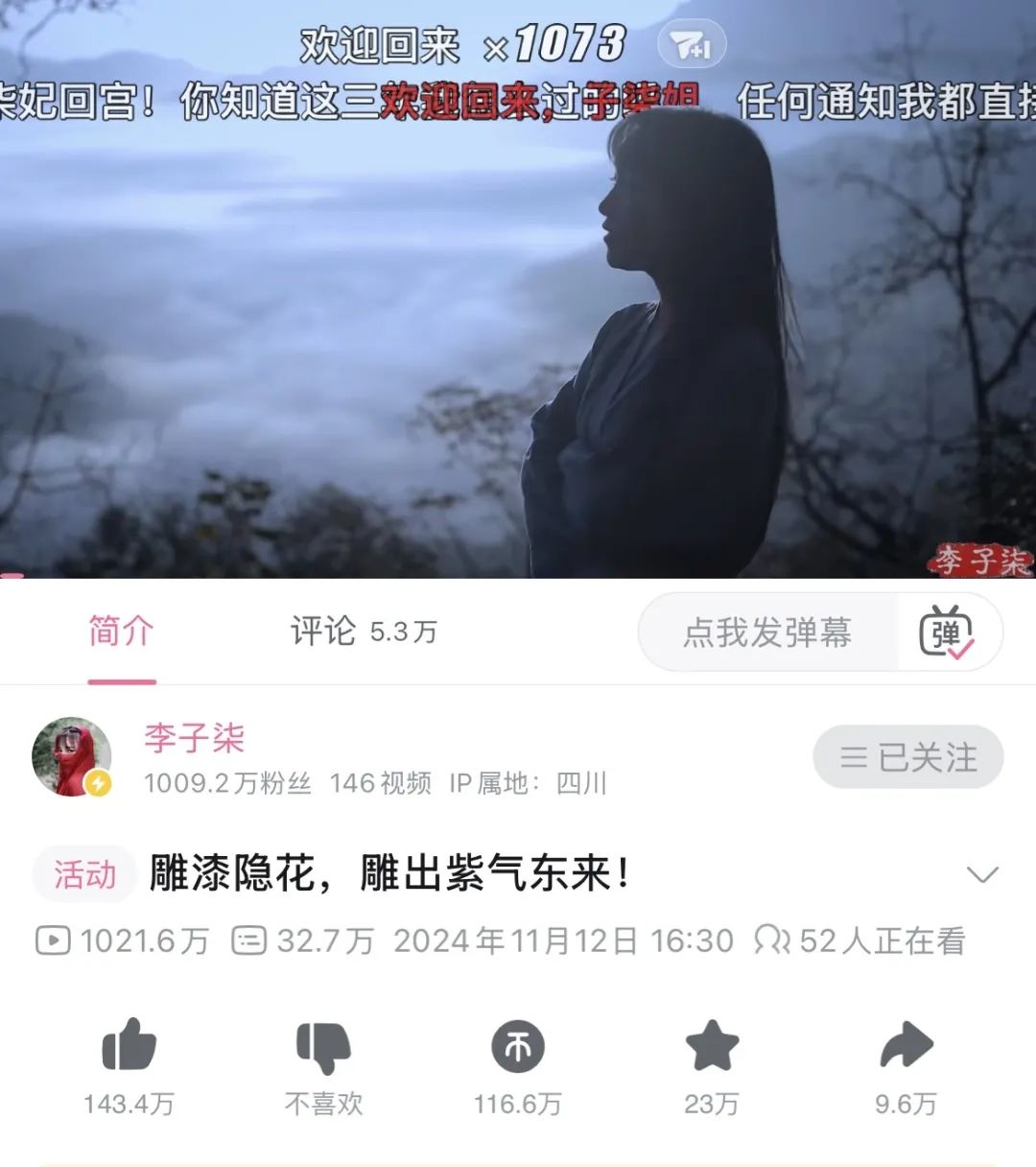 第二类是“有文化”。1个月之前,停更三年多的up主李子柒在各短视频平台宣布回归,复更关于大漆技艺制作的视频“雕漆隐花,雕出紫气东来”,全平台播放量过亿,在评论区和弹幕区随处可见“欢迎回来”“今夕是何年”“爷爷/奶奶,你关注的up主更新了”等网友留言,近乎形成了某种现象级的“集体狂欢”。