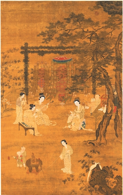 宋人李嵩的《观灯图》(台北故宫博物院藏)描绘了妇孺儿童元宵夜宴饮、乐赏灯戏的场景。李嵩是宫廷画家,山水、人物、花鸟样样在行。这幅《观灯图》的背景似是一富贵人家的后院花园之中,苍松翠竹,芳草萋萋,曲桥护栏,花灯悬空,璀璨绚丽,嶙峋的怪石上立有一对五彩雉鸡。居于画面中央的是4位衣着典雅的仕女,左边3位正在弹奏乐器,站立者正奏檀板,两位坐着的仕女一位吹箫、一位横弹琵琶。这种横弹琵琶的方式,今天只在泉州南音中可以得见。右边的仕女正在逗孩童,她身后还有两位童子,手上各提一盏灯,其中一盏做成兔子的样子,颇有童趣。旁边的方桌上,摆着酒壶、碗碟,还有一盏走马灯。