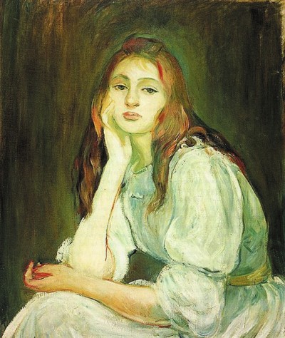 朱莉生于1878年,母亲贝尔特·莫里索以《摇篮》和《洛里昂港风景》博得印象派诸画家赞赏,由此跻身巴黎独立画坛,一跃而为该派最杰出的女画家之一。她的夫婿欧仁·马奈为爱德华·马奈的弟弟。这一姻亲关系使得天资绝高的朱莉成为马奈家族的“天之骄女”。爱德华·马奈特别疼爱侄女,将伊作为最称心如意的模特儿,在她还是婴儿时就白描下小丫头惹人疼爱的圆韵面庞,映出梦幻的形影。这位美姝一头飘逸的褐色长发,一袭“美好时代”的白色长裙,倩影幽幽,漫步花间,自然曼妙,她本人也是一位珠玉璎珞的梦画才女,留有别具慧眼的印象画幅。