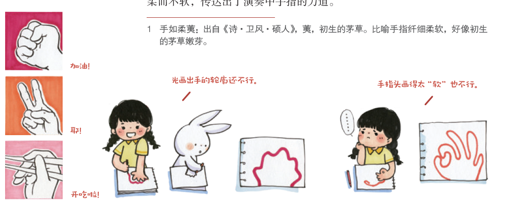 围绕画作讲解,书中还设置了“画里有话”板块,对一些与中国画相关的概念、历史文化知识展开介绍,同时,对书里出现的生僻字词,都标注了拼音。为了增加阅读趣味,书中还结合画作讲解,设置了一些互动小游戏,帮助读者轻松开启艺术大门。《状貌写神的人物画》中赏析《吹箫仕女图》时,延伸讲到“画人难画手”,让读者动手实践画手的难度。