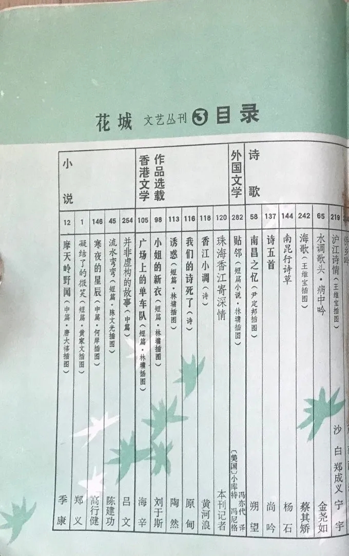 编辑部还邀请了林墉、伍启中、陈衍宁、方楚雄等一批画家画插图。后来出版了一本《林墉插图选》。创刊号目录采用套色、竖排,让人眼前一亮,这是易征从香港学来的,内地还没有。《花城》的每个细节,都充满了创新。
