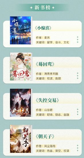 《小惊喜》《失控交易》《蓦回鸾》《朝天子》入选第一期“悦读新书榜”。《小惊喜》以细腻笔触讲述了中国人在澳洲移民道路上的艰辛与坚持。作为荣获“五个一工程”奖的网络文学作者,麦苏善于通过独特的视角,展现各行各业女性的奋斗与成长。山谷君的《失控交易》聚焦小镇做题家在复杂金融世界里的拼搏历程,海青拿天鹅在新作《蓦回鸾》中用其一贯大气古朴的文风将历史厚重感与人物情感巧妙融合,风尘落雨的《朝天子》则将一个少年在波澜壮阔的历史洪流中谱写热血传说的历程描绘得动人心弦。