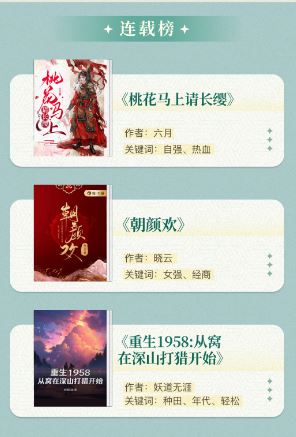 本期“悦读连载榜”上榜作品题材多元、类型丰富,其中六月的《桃花马上请长缨》已改编为短剧并颇关注;此外,晓云的重生复仇权谋作品《朝颜欢》让读者在体验角色成长与逆袭的过程中,享受到了酣畅淋漓的阅读快感;而妖道无涯的《重生1958:从窝在深山打猎开始》则开辟了一条充满冒险与生存智慧的新叙事之路,为读者带来了全新的阅读体验。