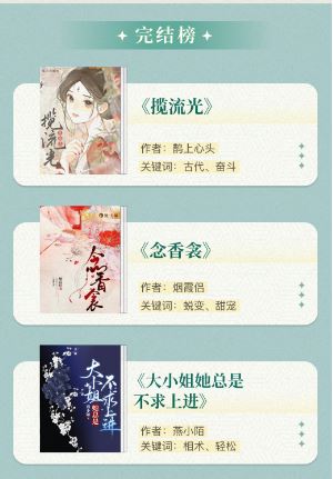 本期“悦读完结榜”作品则充分展现女性情感故事的魅力,《揽流光》《念香衾》《大小姐她总是不求上进》等作品于古代社会背景下,刻画出不断成长、清醒独立又具备家国情怀的女性形象,引发读者共鸣。其中,《揽流光》《大小姐她总是不求上进》分别由畅销作者鹊上心头和燕小陌所创作,而《念香衾》出自新人作者烟霞侣之手,目前已成功售出漫画、有声版权。