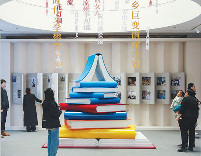 步入“歌以咏志 星汉灿烂——新时代文学成就展”展厅,书山模样的艺术装置矗立展厅中央。