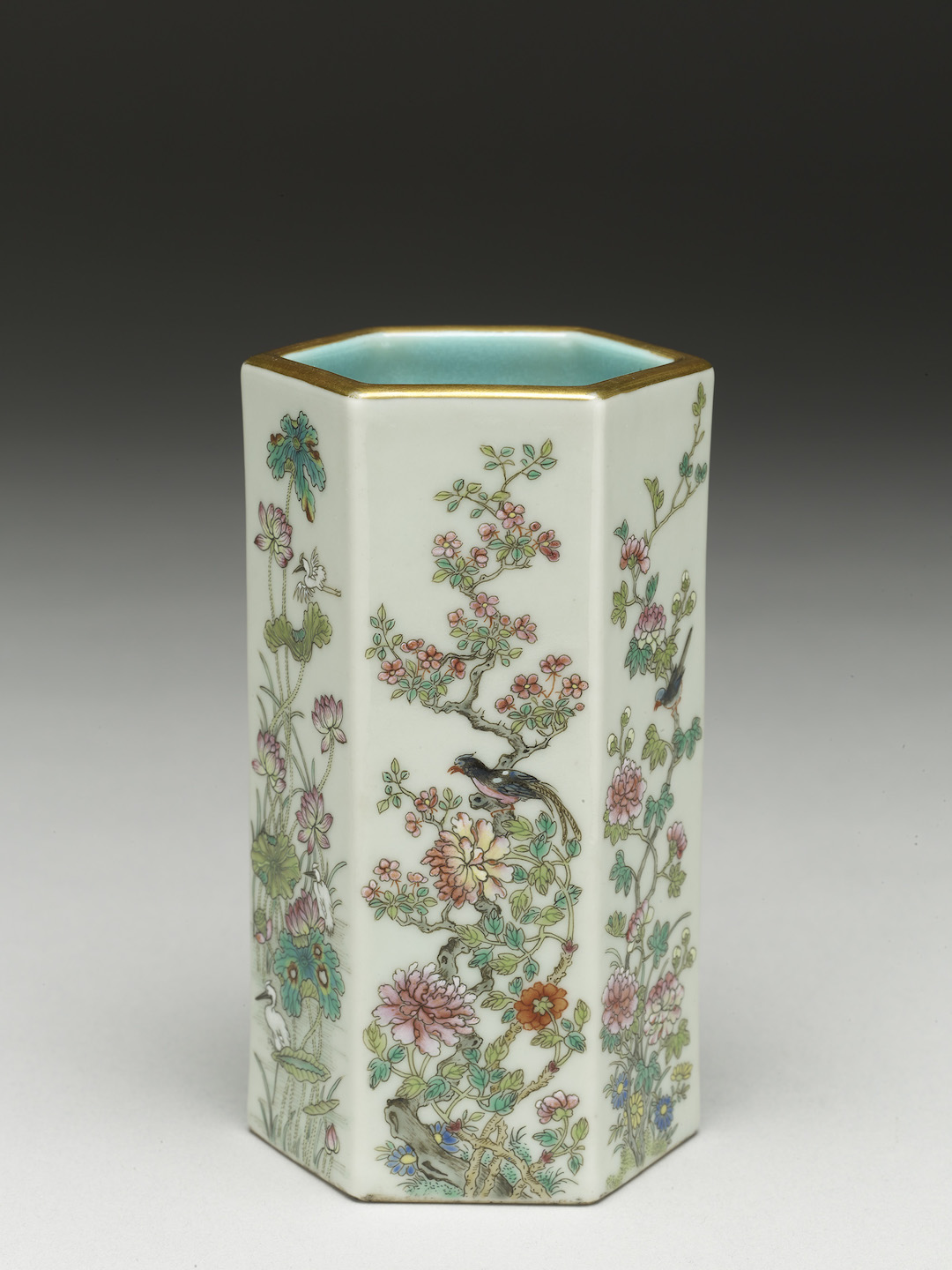 此粉绿色六方笔筒各面描绘花卉,呈现大自然的四季变化,以牡丹、芍药、月季代表春季,莲花代表夏季,菊花代表秋季,以及白梅代表冬季,并搭配绶带、鹭鹚等各种鸟雀。底有红彩书“大清嘉庆年制”六篆字款。