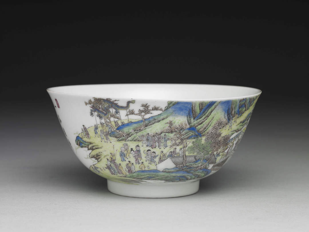 展出的此对“珐琅彩灯火升平图碗”描绘上元佳节的景致。器外壁一面彩绘青绿山林与楼阁,游人如织,人群或伫立桥上看花灯,或观赏舞龙等各式表演。另一面墨书:“一派欢声和鼓吹,六街灯火乐升平”,以及红料书“先春”、“山高”、“水长”三印。器底青花书“乾隆年制”双方框楷款。